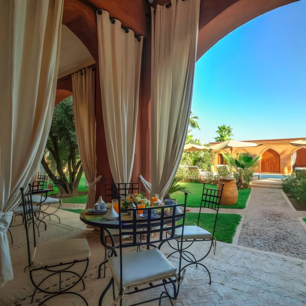 Dans notre villa d’hôtes, le matin s’ouvre comme une parenthèse de douceur. Dans la lumière naissante, les parfums de pain chaud, de miel et de café accompagnent un petit déjeuner célébrant les saveurs marocaines : msemen dorés, baghrir moelleux, pain maison du jour, jus d’orange fraichement pressé, etc…